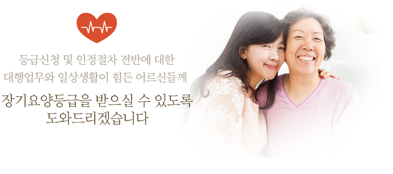 장기요양신청 대상은 스스로 일상생활이 곤란한 65세 이상 노인과 치매, 뇌혈관성 질환, 파킨슨병 등 노인성 질환을 가진 65세 미만자이며 신청접수는 국민보험공단 지사에 설치된 장기요양보험 운영센터에서 할 수 있다. 신청인의 심신상태를 조사하여 '장기요양인정점수'를 산정하여 등급을 판정하며, 요양 1~5등급으로 판정 받을 경우 장기요양급여 서비스를 이용할 수 있다.